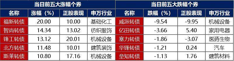 【转债市场主要指数跟随收涨】 2月19日,转债市场跟随权益市场有所反弹,当日中证转债、上证转债、深证转债分别收涨0.95%、0.77%、1.22%。当日,转债市场成交额810.18亿元,较前一交易日放量93.66亿元。转债市场个券多数上涨,500支转债中,425支上涨,69支下跌,6支持平。当日上涨个券中,福新转债涨停20%,智尚转债涨超14%,锋工转债涨超13%;下跌个券中,威派转债跌逾9%,亿田转债跌逾3%。