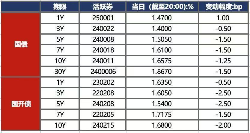 2月19日,受资金面转松,以及有关后续降准降息传闻提振,债市震荡回暖。截至北京时间20:00,10年期国债活跃券240011收益率下行1.25bp至1.6575%,10年期国开债活跃券240215收益率下行2.00bp至1.6800%。