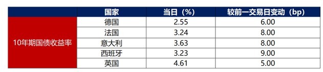 2月19日,主要欧洲经济体10年期国债收益率普遍上行。其中,德国10年期国债收益率上行6bp至2.55%,法国、意大利、西班牙、英国10年期国债收益率分别上行8bp、8bp、9bp和5bp。